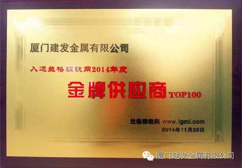 在蘭格鋼鐵網(wǎng)的主持下,經過數(shù)輪謹慎、公正評選,"蘭格鋼鐵網(wǎng)金牌供應商TOP100"評選結果終于塵埃落定。建發(fā)金屬公司憑借專業(yè)服務、守信經營,獲評蘭格金牌供應商TOP100,并受頒牌匾和證書。此次金牌供應商的評選活動由蘭格鋼鐵網(wǎng)聯(lián)合全國主要省市建委、各省市鋼鐵貿易商會協(xié)會、下游用鋼行業(yè)協(xié)會、大型工程采購企業(yè)等共同開展,入選的企業(yè)都是具有一定規(guī)模和實力,供應正品材,價格實惠,準斤足量、服務到位的企業(yè),具備較高的行業(yè)權威性和認可度。