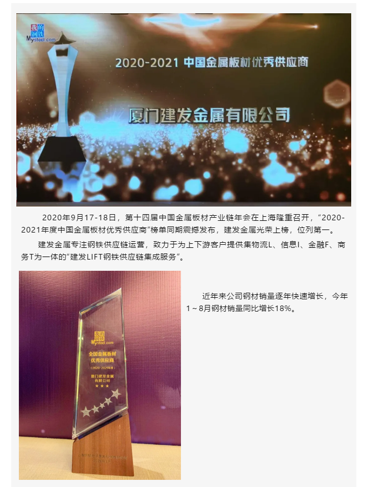 位列第一 | 建發(fā)金屬獲評“2020-2021年度中國金屬板材優(yōu)秀供應(yīng)商”