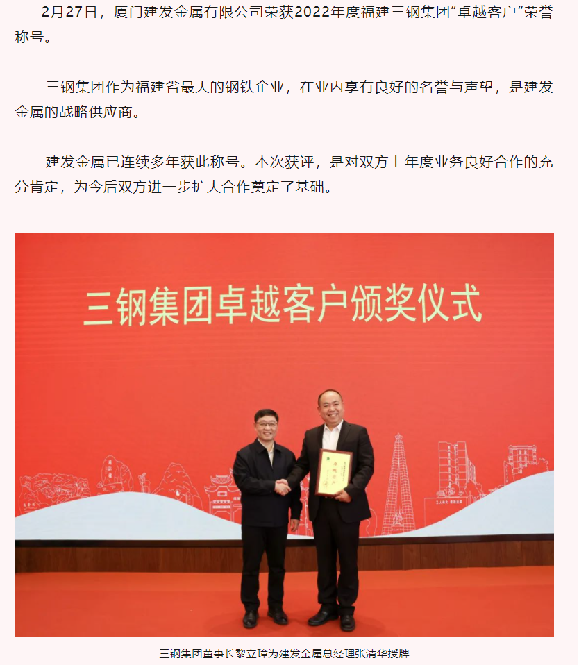 建發(fā)金屬獲評(píng)三鋼集團(tuán)“卓越客戶(hù)”榮譽(yù)稱(chēng)號(hào)